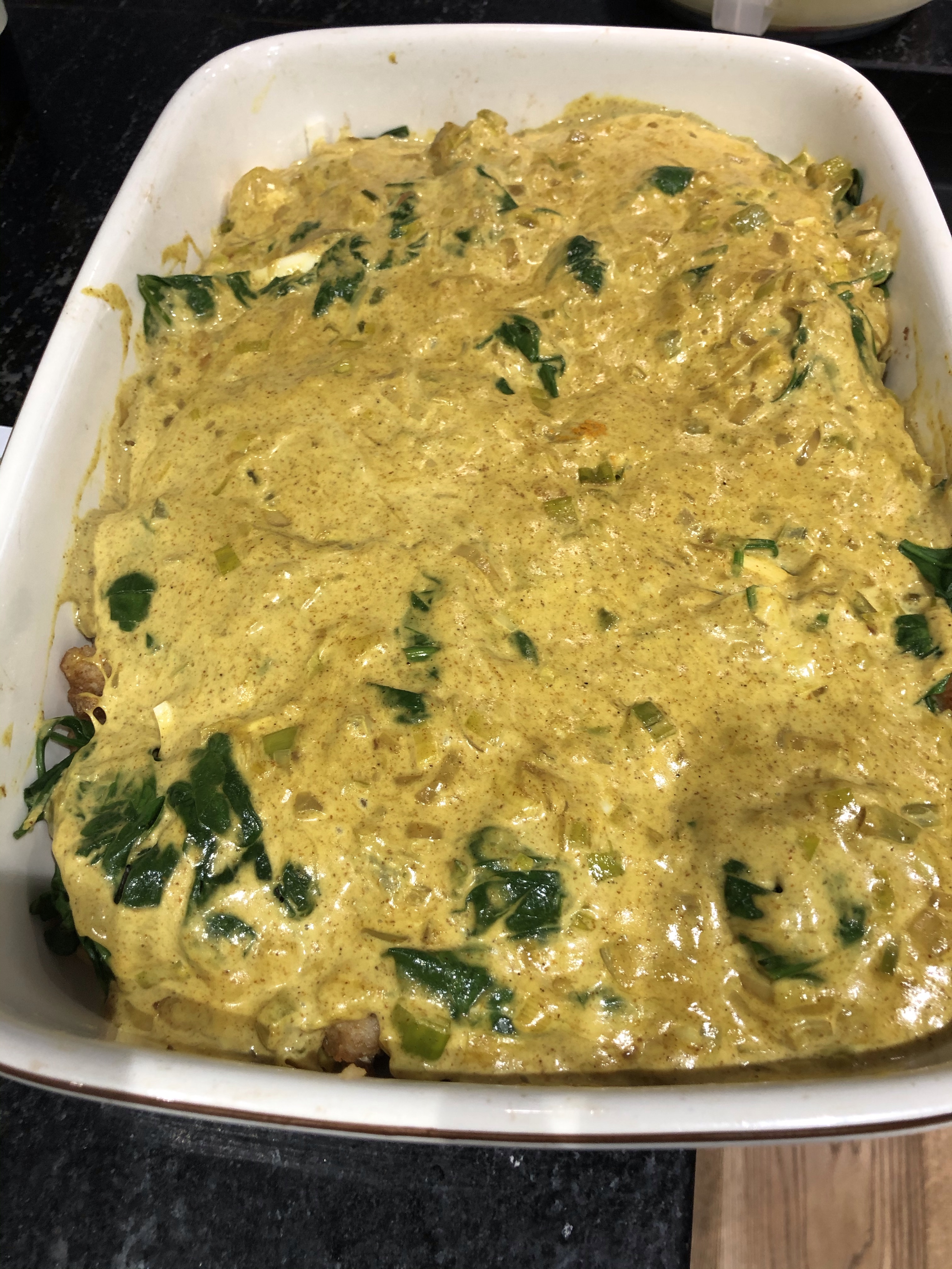 Cook the spinach, I buy ready washed spinach ( lazy I know) as then I can just pop the bag as it is into the microwave and zap for two minutes, pop open the bag, remove spinach and drain in some paper towel, it will not be very wet anyway.