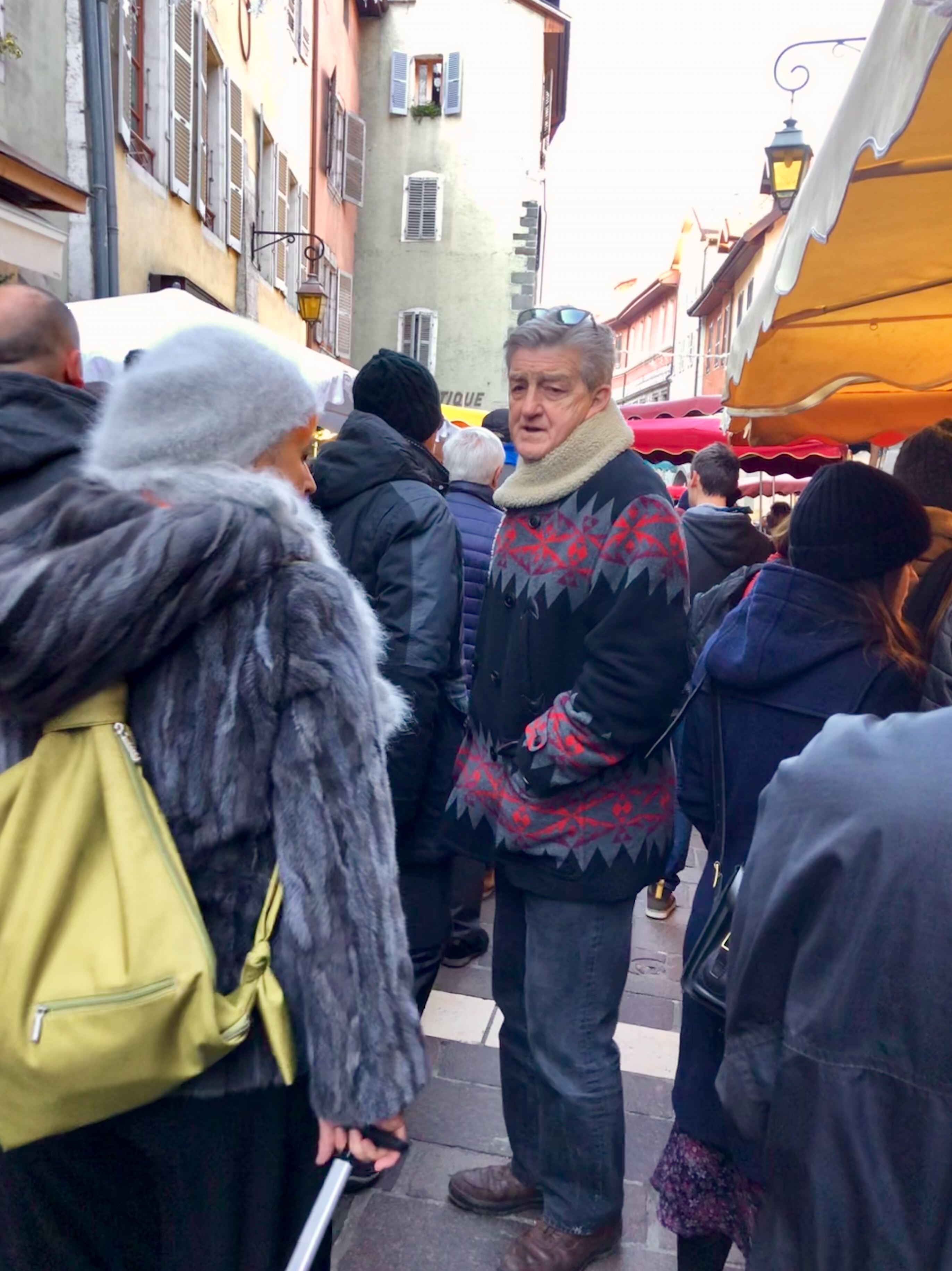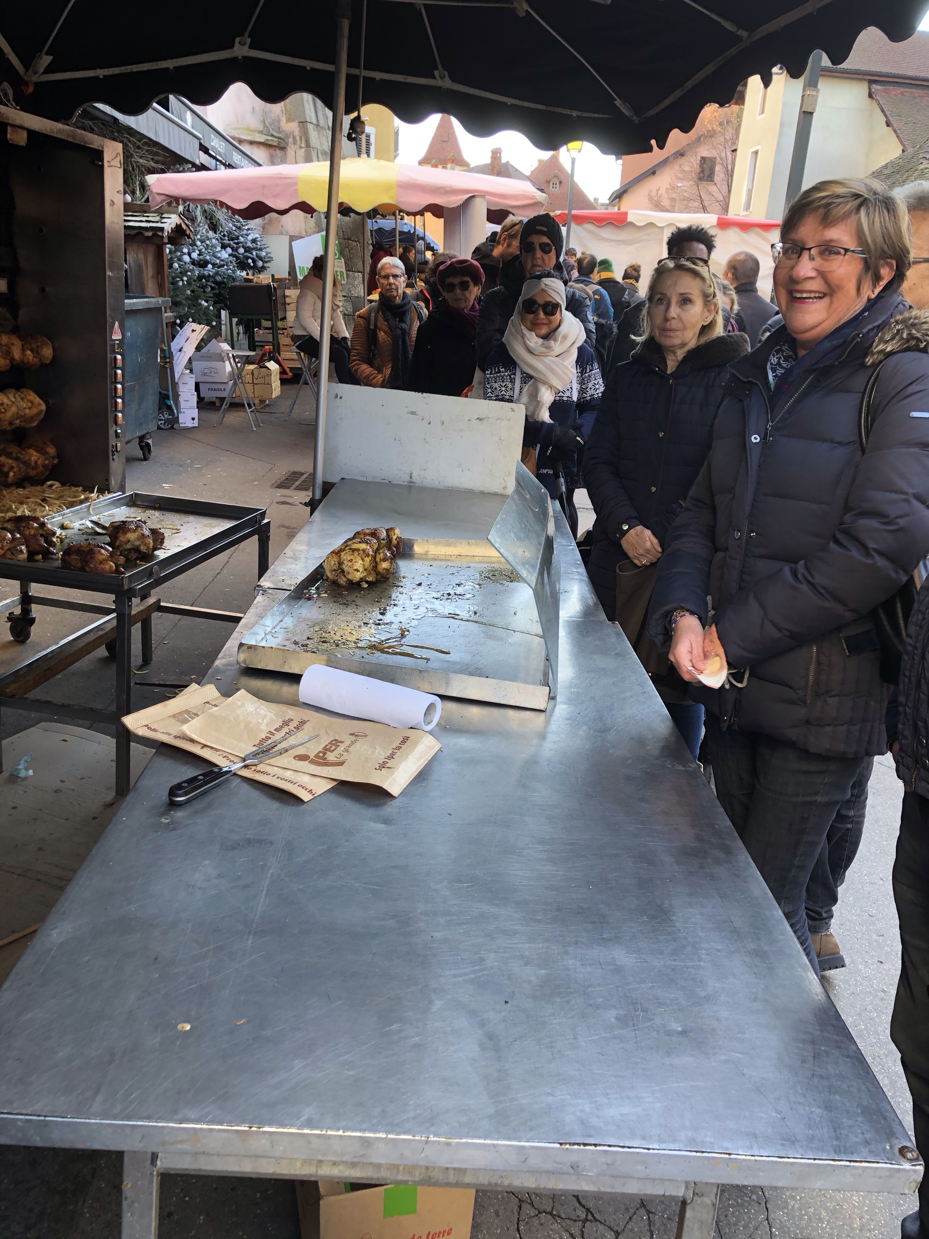 It was Sunday and the Sunday market in Annecy is the best. In summer it is heaving, with tourists, with gawkers, with families just wanting to get the kids out, with kids being trampled on, left right and centre, babies in strollers, so low to the ground, that you trip over them, fashionistas with their designer dogs, either getting under your feet or being carried in arms like babies, people with walking sticks, ready to bash your ankles if you jump the queues, and the locals who come every week to buy their fruit, vegetables, cheese, cold meats, fish, oysters ( when in season) and don’t forget the inevitable roast chicken man, or even men, and of course the Vietnamese with their nams, and the Alsacienes with their plates of choucroute, or the Spanish with their Paella’s, the list is endless.