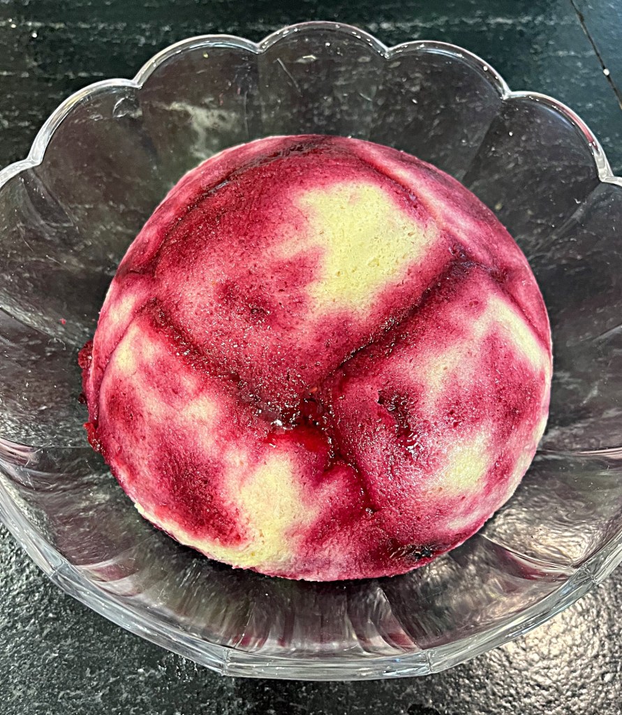 When ready to serve, remove the top layer of Cling film, place a rimmed plate on top and invert the mould. Remove the cling film, and spoon over the rest of the juice so that all of the bread is a beautiful shade of deep pink. Serve with Yoghurt or better still CREAM!